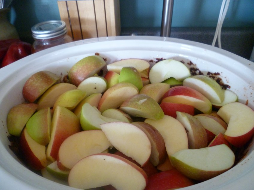 Placing the apples on top of the mash after the first and second 10 hour cooking period.