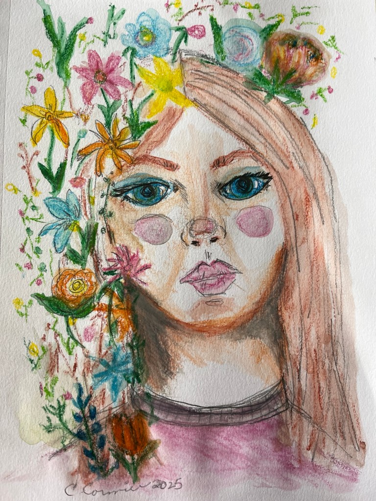 I have an account with Creative Bug and after a long absence I went back to check out the new demos and classes for inspiration. I’ve started playing with more lettering and for today’s post I went back to my watercolour crayons and experimented combining florals with portraits.