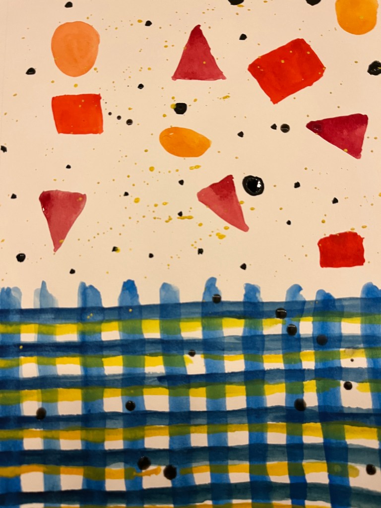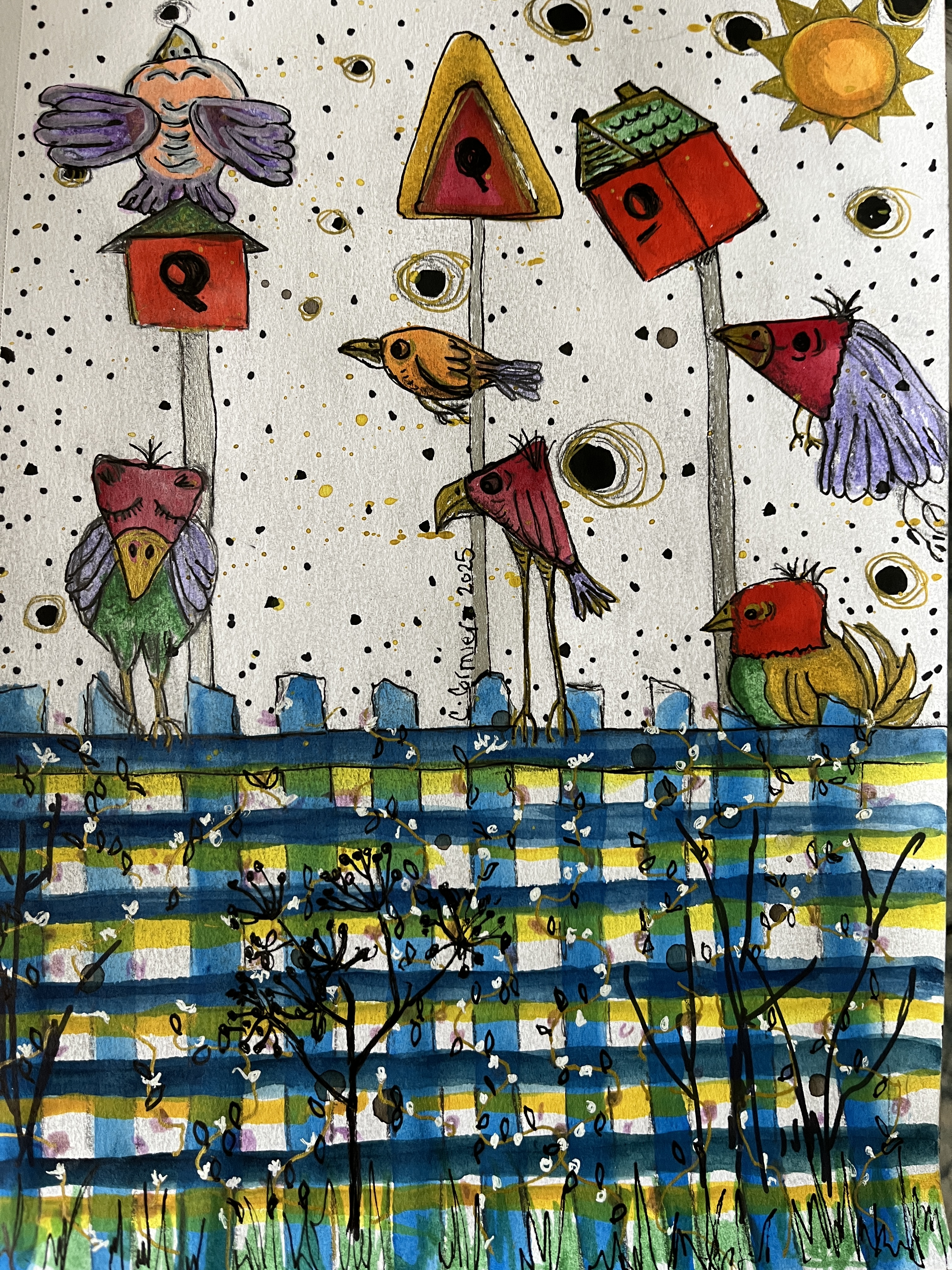 This page was a lot of fun. I really didn’t know how I was going to approach the marks that I had laid down but I remembered how I used to create birds from scraps of paper. I decided to use the blobs like I would paper scraps and the plaid below became a fence.