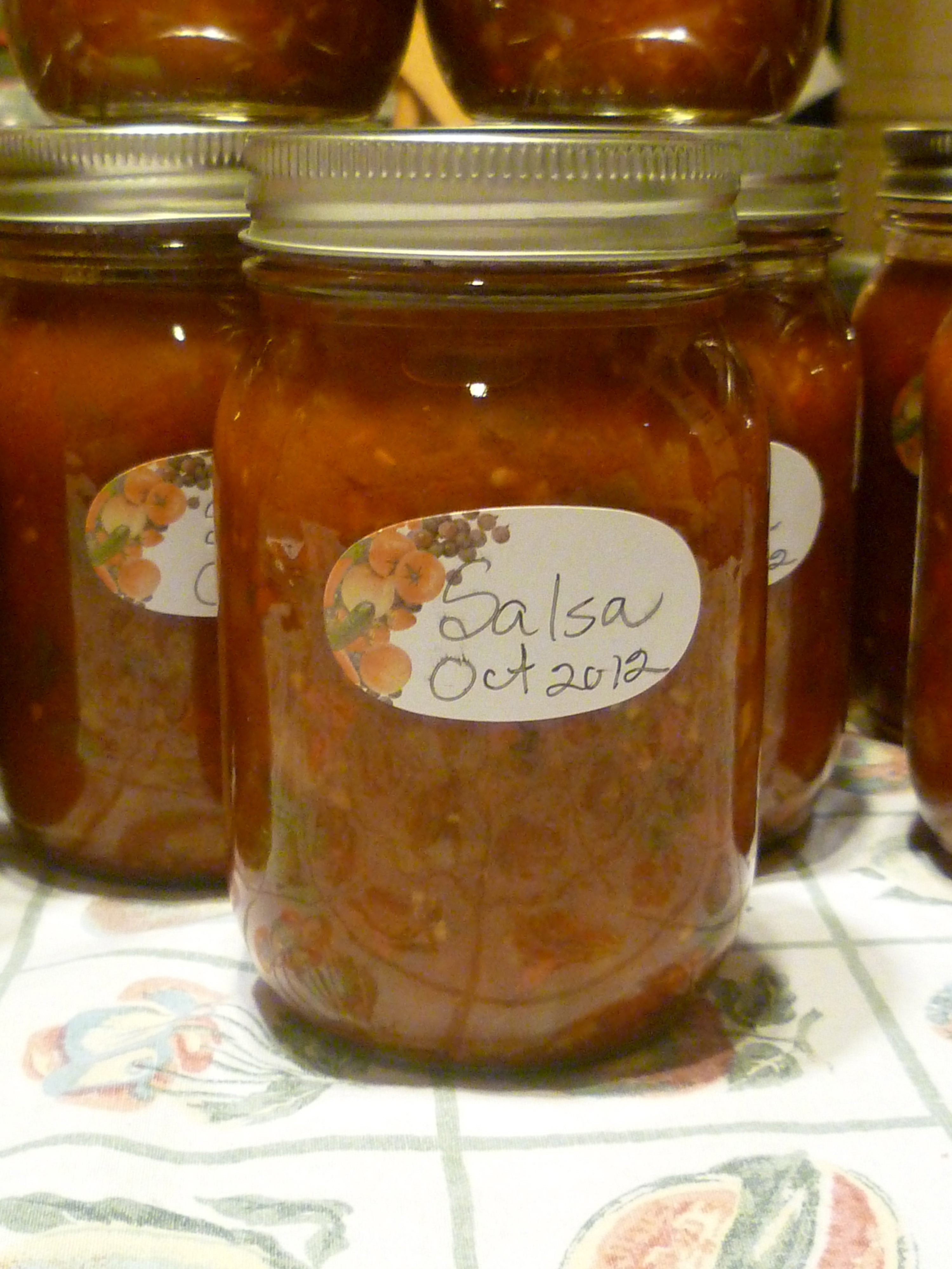 I put the salsa into hot sterilized jars and then into a water bath for 20 minutes. In fact the jars are in the bath as I write. I will post pictures of the finished product tomorrow along with the directions for the apple butter.