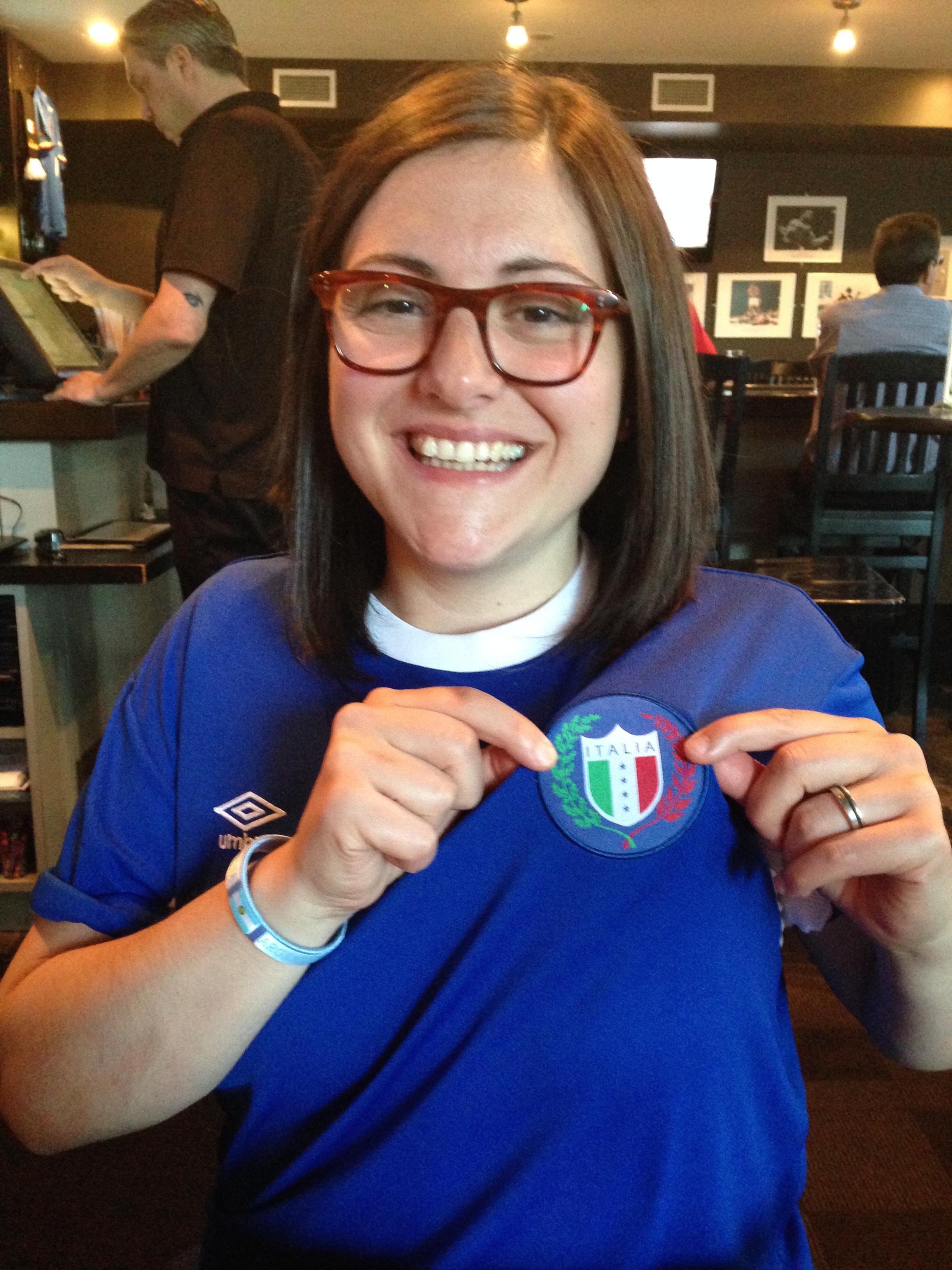 We arrived 30 minutes before the game and the place was pretty empty but it started to fill up quickly. Luckily the table next to us was also filled with fans of the Azzuri but the rest of the place was clearly filled with English fans. Before the game started my husband opened up his Father’s Day gifts from me and his daughters. Unfortunately we couldn’t convince him to wear his Italian jersey. He said it was too small but when he tried it on this morning I thought it was fine. During the game J wore the shirt so that there was no doubt which team our table was cheering for.IMG_1807