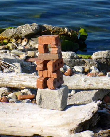 This is the park that Frances, my husband and I walked through every day (when I’m not at the cottage or away). This morning on our usual walk to the point I noticed that there were more pieces of installation art that someone has created, using the bricks and rubble from the landfill along the shoreline.