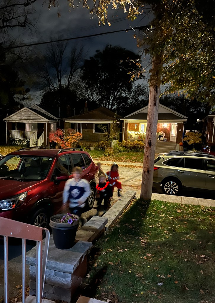 In total we had 64 kids come to our door. I felt badly when I ran out because I know that there would have been more. One of the things that I loved about Hallowe’en this year was the sense of community with those that participated. We walked up and down the street and talked to our neighbours and chatted with the parents when they brought their children up to the door. My husband and I both shelled out the treats and we were able to sit outside because the weather was so mild.
