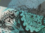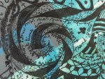 Here are some of the prints that I made. I’m not sure that any of them are worthy of framing but the whole idea behind gelli printing is creating a large number of prints at one time and then deciding which you like. You can always go back later and add more detail or use the prints as background for another art project. I chose to do the later with one of the prints. I wondered what a circular Zentangle would look like on a printed background.